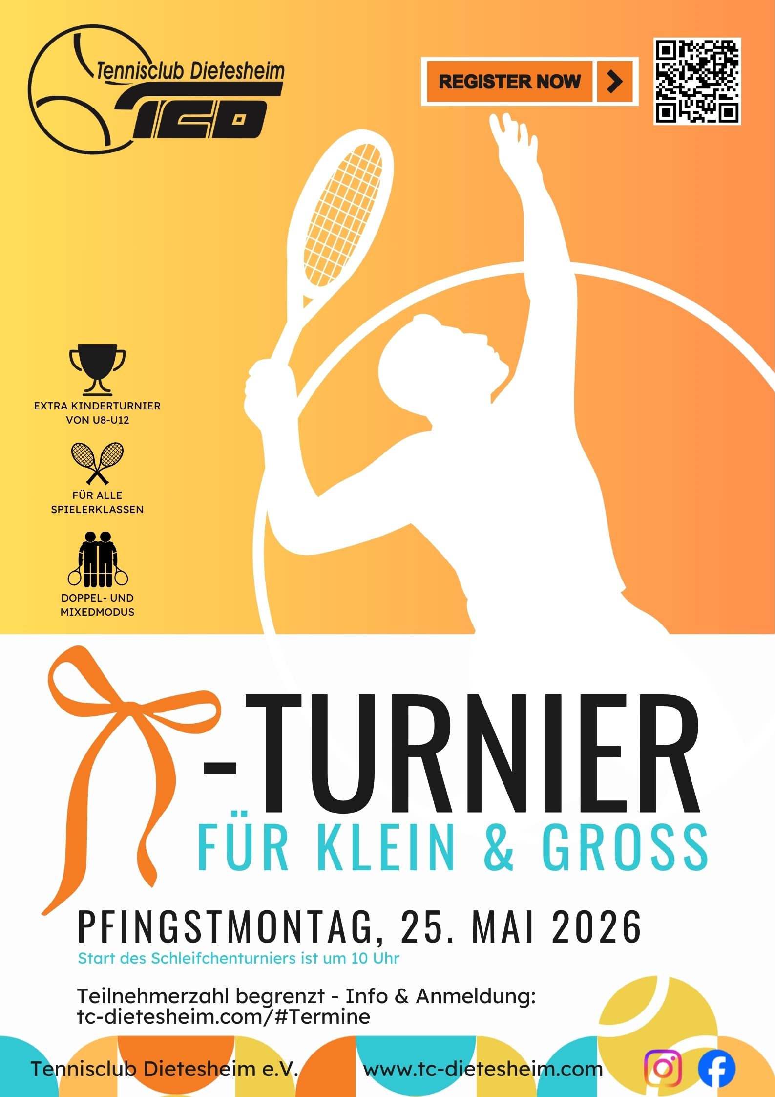 Lockeres Spaßturnier ab 16 Jahren im Doppel- und Mixed-Modus mit anschließendem italienischen Buffet; Teilnehmerzahl begrenzt - aufgrund des großen Interesses ausschließlich TCD-Mitglieder in den Paarungen zugelassen. Details und Anmeldung