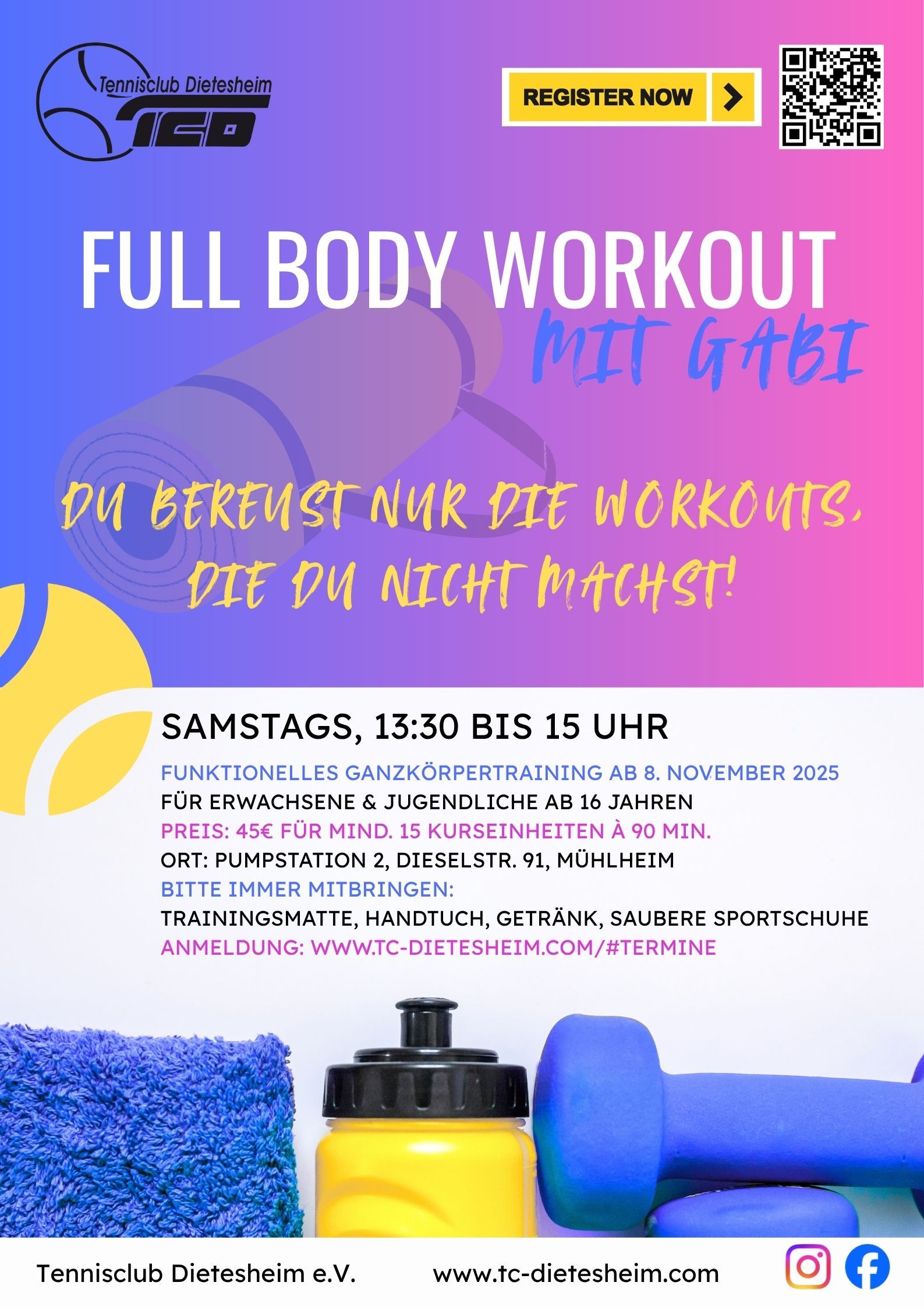 Mitzubringen: Handtuch, Trainingsmatte, Getränk, saubere Sportschuhe & vor allem Lust auf Bewegung!