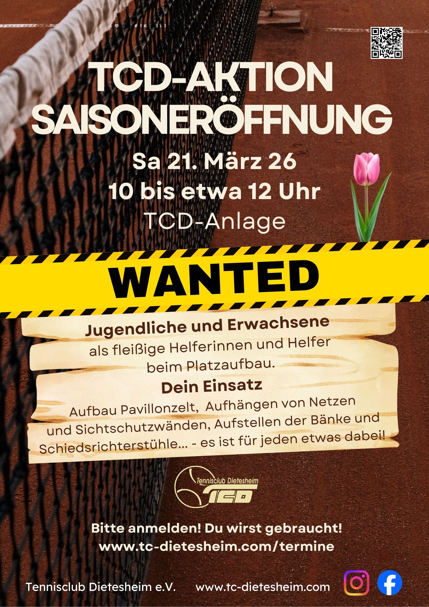 Gesucht werden Jugendliche und Erwachsene als Helferinnen und Helfer, um die TCD-Anlage fit für Sommersaison zu machen. Kommt vorbei und helft mit! Wir freuen uns auf Eure Unterstützung! Bitte meldet Euch an und kommt in Tennisschuhen, um die frischen Plätze zu schonen! Anmeldung
