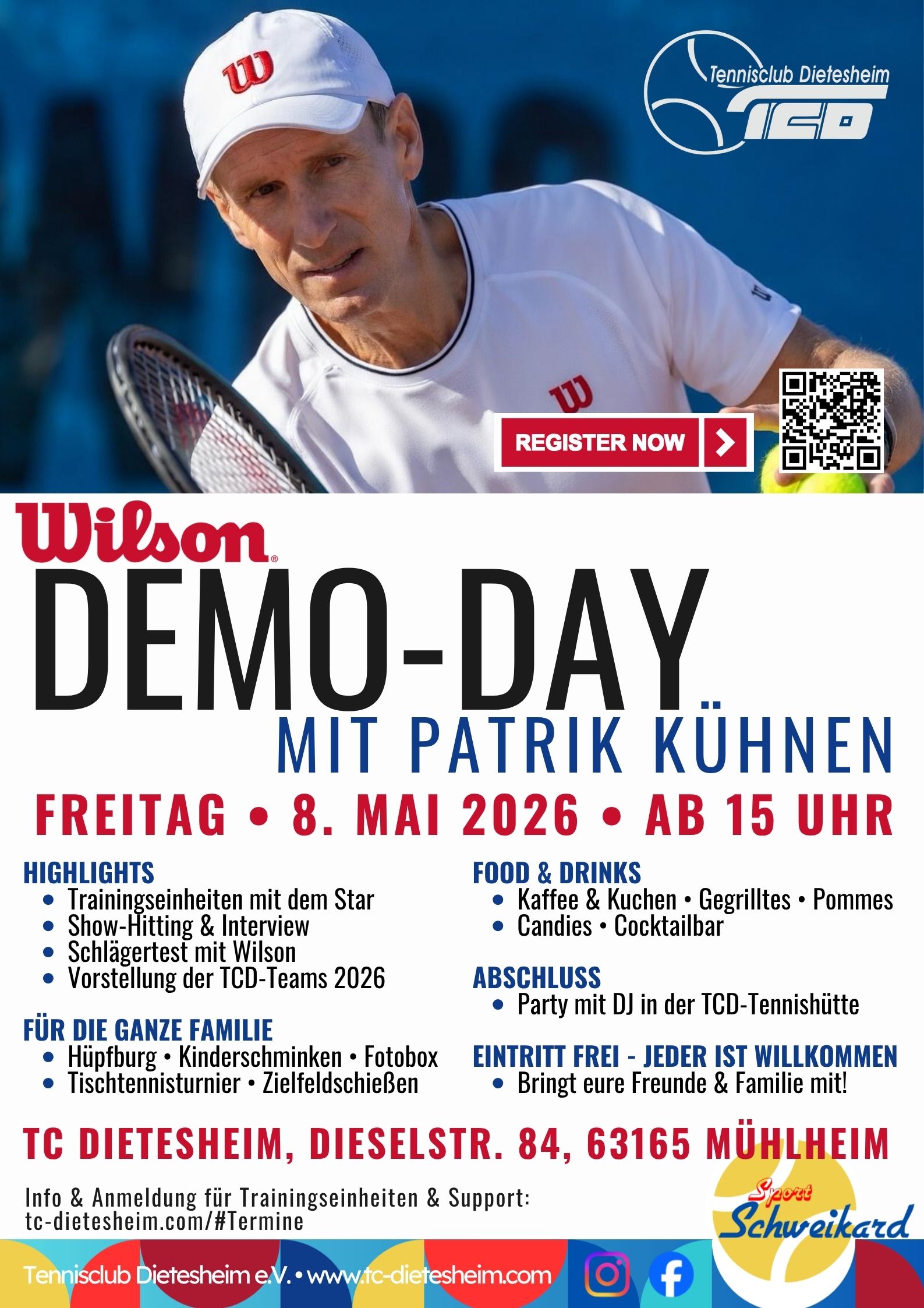 Wir begrüßen den ehemaligen Davis-Cup-Sieger Patrik Kühnen auf unserer Anlage - ein echter Topstar des deutschen Tennissports. Freut euch auf einen abwechslungsreichen Tennistag: Trainingseinheiten mit dem Profi, Show-Hitting hautnah, kostenloses Testen der neuesten Wilson-Schläger, buntes Rahmenprogramm, DJ in der Tennishütte.
